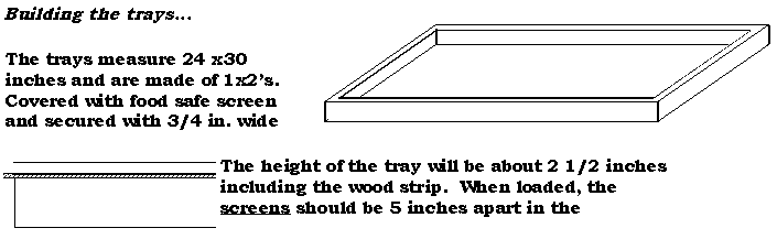 The tray runners are made up of 2x2's measuring 32 inches long, spaced 3 inches apart. Space the runner braces 26 inches apart. Leaving extra space between the right brace and the inside wall, this will allow the air to circulate.